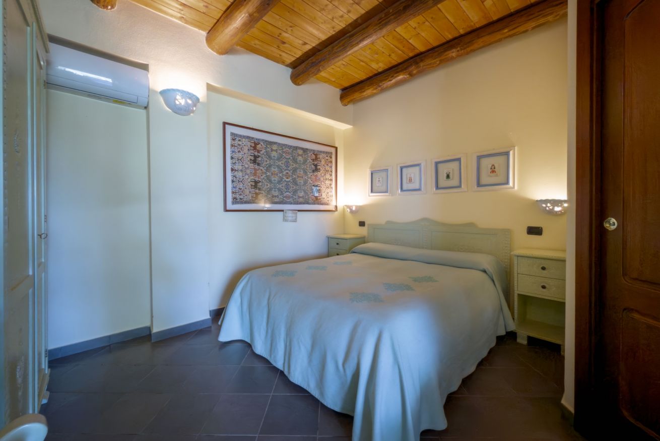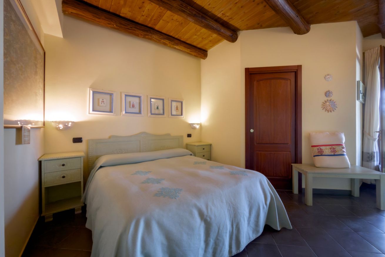 La camera Classica di Sa Mandra è un rifugio accogliente dallo stile rustico elegante, dove ogni dettaglio racconta la tradizione sarda. Gli arredi artigianali intarsiati a mano e i colori caldi creano un ambiente che profuma di autenticità e comfort.